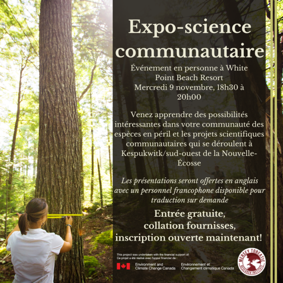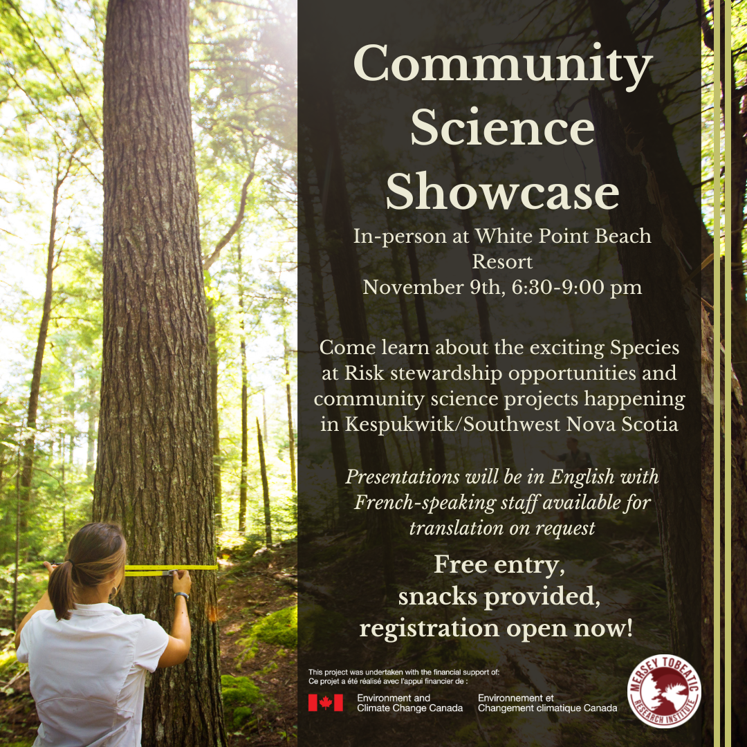 Come out and learn about the exciting species at risk stewardship opportunities and community science projects happening in Kespukwitk (Southwest Nova Scotia) during our Community Science Showcase on November 9th, 6:30-9:00 pm at White Point Beach Resort.
